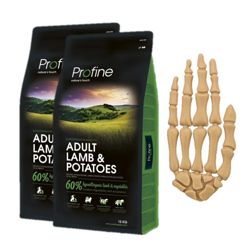 Carne de cordero deshidratado (35 %), patatas (25 %), maíz, grasa de pollo (conservada con tocoferoles mezclados, fuente de vitamina E), manzanas secadas, levadura de cerveza, hígado de pollo hidrolizado, gambas (1,5 %), aceite de salmón (1 %), algas marinas (0,5 %), sulfato de glucosamina (0,02 %), raíces de achicoria (fuente de manano-oligosacáridos 0,018 %), mezcla de hierbas (hinojo, albahaca, salvia 0,018 %), fructo-oligosacáridos (0,012 %), extracto deyucca schidigera (0,01 %), sulfato de condroitina (0,012 %), extracto de caléndula (0,01 %).