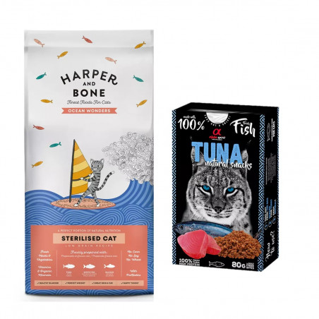Salmón preparado en fresco 18,2%, atún preparado enfresco 17,4%, guisantes verdes enteros, atún deshidratado 11%, proteínade patata, proteína de arroz, cebada integral 4,4%, pescado blancopreparado en fresco 4%, fibra de manzana, avena integral 3,5%, hidrolizado de pescado 1,8%, patata dulce deshidratada 1,6%, semillasde lino (fuente natural de ácidos grasos @3) 1,5%, proteína de guisantes,pulpa de remolacha, arroz integral 0,5%, levaduras (Saccharomycescerevisiae), aceite de pescado (protegido con tocoferoles naturales) 0,4%, minerales, brócoli fresco 1000 mg/kg, calabaza fresca 1000 mg/kg,zanahorias frescas 1000 mg/kg, manzanas frescas 1000 mg/kg, paredcelular hidrolizada de levaduras (fuente de MOS) 1000 mg/kg, achicoria (fuente de FOS) 1000 mg/kg, glucosamina 500 mg/kg, extracto demandarina 500 mg/kg, condroitina 300 mg/kg, Yucca schidigera 200 mg/kg, alga kelp 30 mg/kg, arándanos rojos enteros 30 mg/kg, rosa canina(rica en vitamina C) 30 mg/kg, té verde 30 mg/kg, cúrcuma 30 mg/kg.