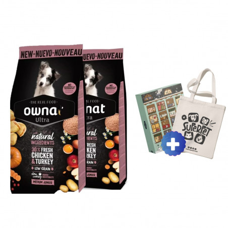 Pollo deshidratada (18%), pollo fresco* (15% mín. antes de la cocción), pavo fresco* (15% mín. antes de la cocción), guisantes enteros* (9%), grasa de pollo (preservada con antioxidantes naturales), patata deshidratada* (8%), arroz integral* (7%), raíces de mandioca* (5%), cebada integral* (3%), salmón deshidratado (2,5%), levadura de cerveza* (2%), proteína hidrolizada de pollo (2%), vegetales y frutas frescas antes de la cocción (manzana* 1%, zanahoria* 0,5%, calabaza* 0,5%), huevo deshidratado* (1%), semilla de lino* (1%), aceite de salmón (preservado con antioxidantes naturales), pulpa de remolacha, sal gema*, raíces de achicoria (FOS)*, extracto de levaduras (MOS), algas marinas deshidratadas* (500 mg/kg), glucosamina (500 mg/kg), yucca schidigera, condroitín sulfato (100 mg/kg), arándanos* (100 mg/kg), té verde* (80 mg/kg), equinácea* (80 mg/kg), flor de manzanilla* (80 mg/kg), hinojo* (80 mg/kg).