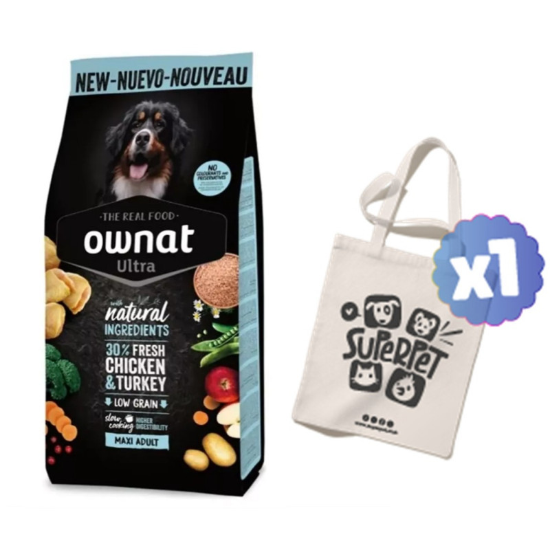 Pollo deshidratado (18%), pollo fresco* (15% mín. antes de la cocción), pavo fresco* (15% mín. antes de la cocción), raíces de mandioca* (8%), guisantes enteros* (7%), arroz integral* (7%), grasa de pollo (preservada con antioxidantes naturales), habas enteras* (4%), cebada integral* (4%), patata deshidratada* (4%), proteína hidrolizada de pollo (2,5%), verduras y frutas frescas antes de la cocción (manzana* 1%, zanahoria* 0,5%, brócoli* 0,5%), cerdo deshidratado (2%), levadura de cerveza* (1%), pulpa de remolacha, vaina de algarroba* (1%), aceite de salmón (preservado con antioxidantes naturales), semilla de lino* (1%), sal gema*, alfalfa deshidratada*, raíces de achicoria (FOS)*, extracto de levaduras (MOS), algas marinas deshidratadas* (500 mg/kg), glucosamina (500 mg/kg), yucca schidigera, condroitín sulfato (100 mg/kg), arándanos* (100 mg/kg), té verde* (100 mg/kg), equinácea* (100 mg/kg), flor de manzanilla* (100 mg/kg).