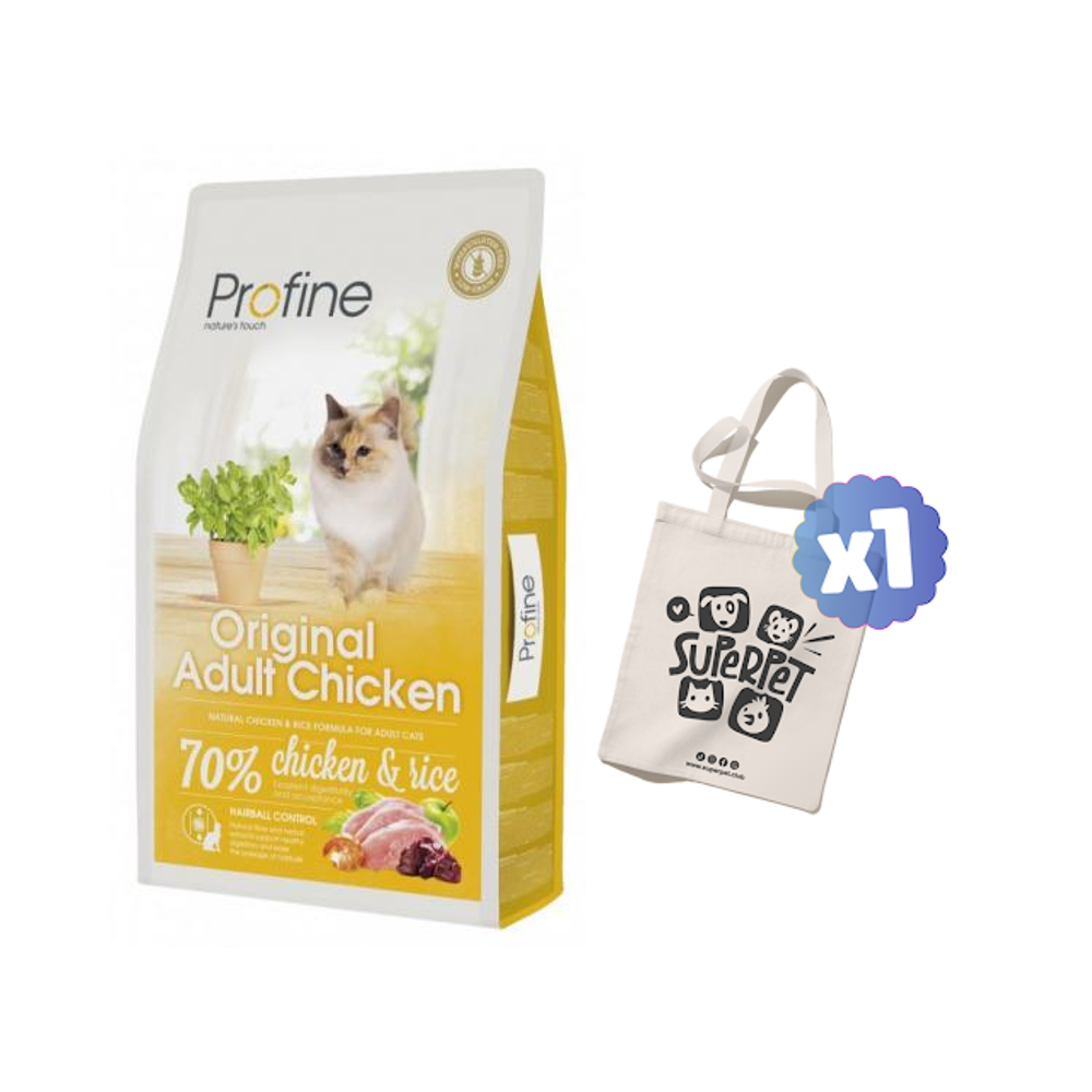 Profine Cat Original Adult para gatos adultos, la receta natural de pollo y arroz para los felinos de raza. El alimento Fit & Vital fue pensado para cumplir todas necesidades nutricionales de los gatos adultos de cualquier raza. Por sus componentes equilibrados de proteínas de alta calidad, grasas y nutrientes vitales, con 14% de grasa y 34% de proteína, hace que sea el alimento superpremium para una óptima energía y vitalidad.