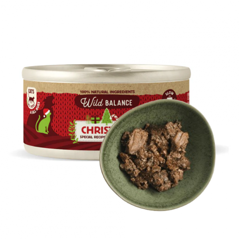 Comida cocinada para gatos de Navidad que combina pollo, ternera, pato y cerdo.